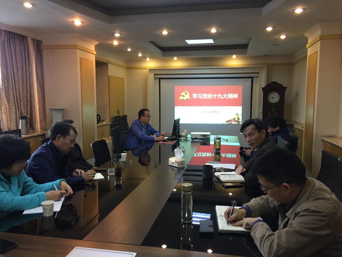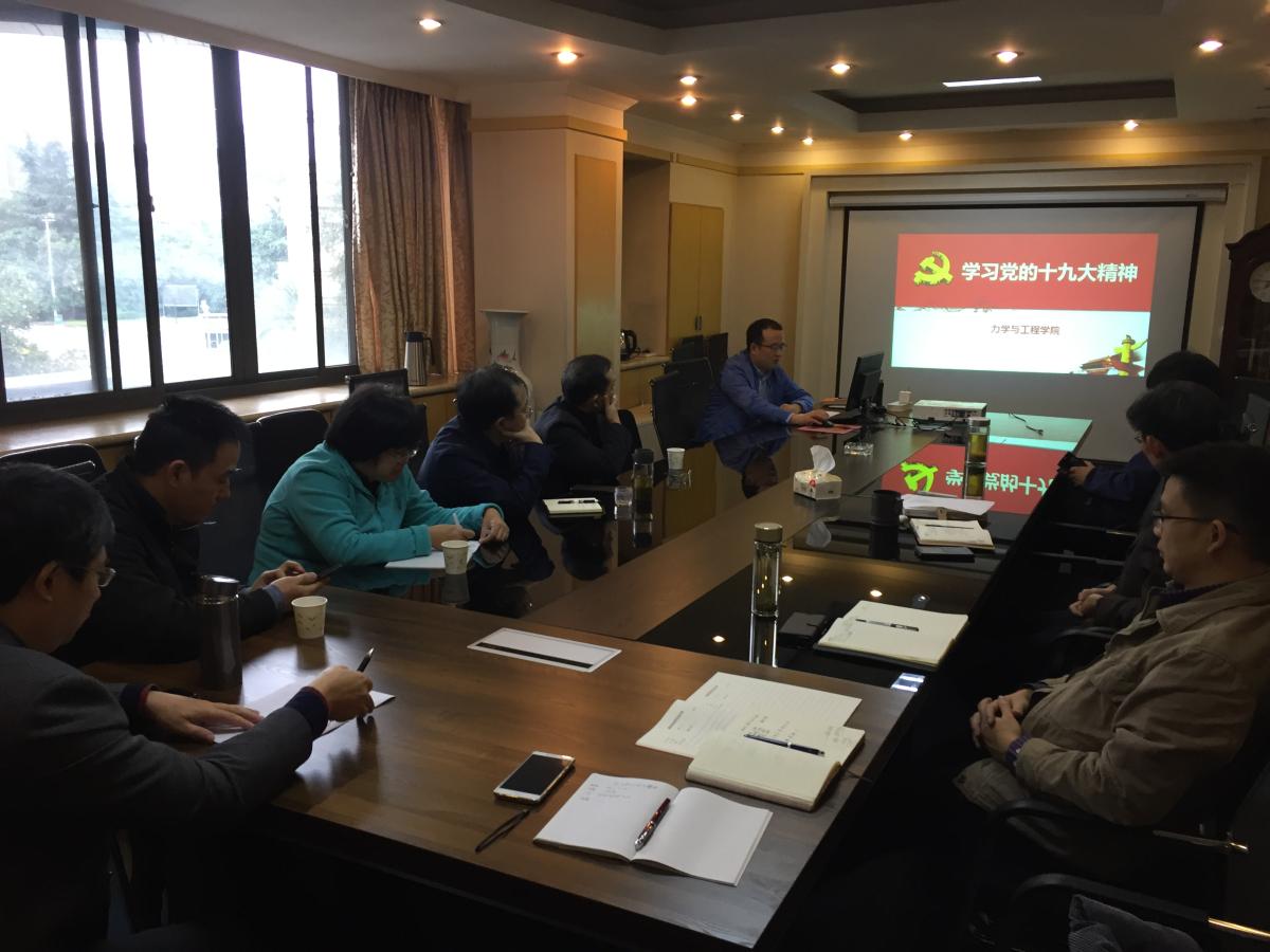 为进一步全面深入学习领会党的十九大精神,2017年10月30日上午9:30,力学与工程学院党委召开党委委员(扩大)会议,专题学习习近平总书记在党的十九大开幕会上所做的大会报告。学院全体领导班子成员、党委委员、纪委委员、全体教职工党支部书记参加学习。会议由学院党委金建明书记主持。