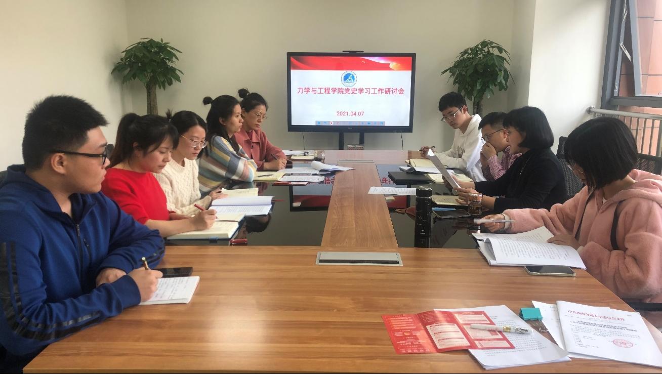 4月7日下午16:00,在犀浦校区3号楼30227会议室,力学与工程学院召开了党史学习教育工作研讨会议。本次会议由学院党委栗民书记主持,党委孔祥彬副书记、学院组织员刘青、学院教师服务中心朱曦和全体学生工作组辅导员老师参加。