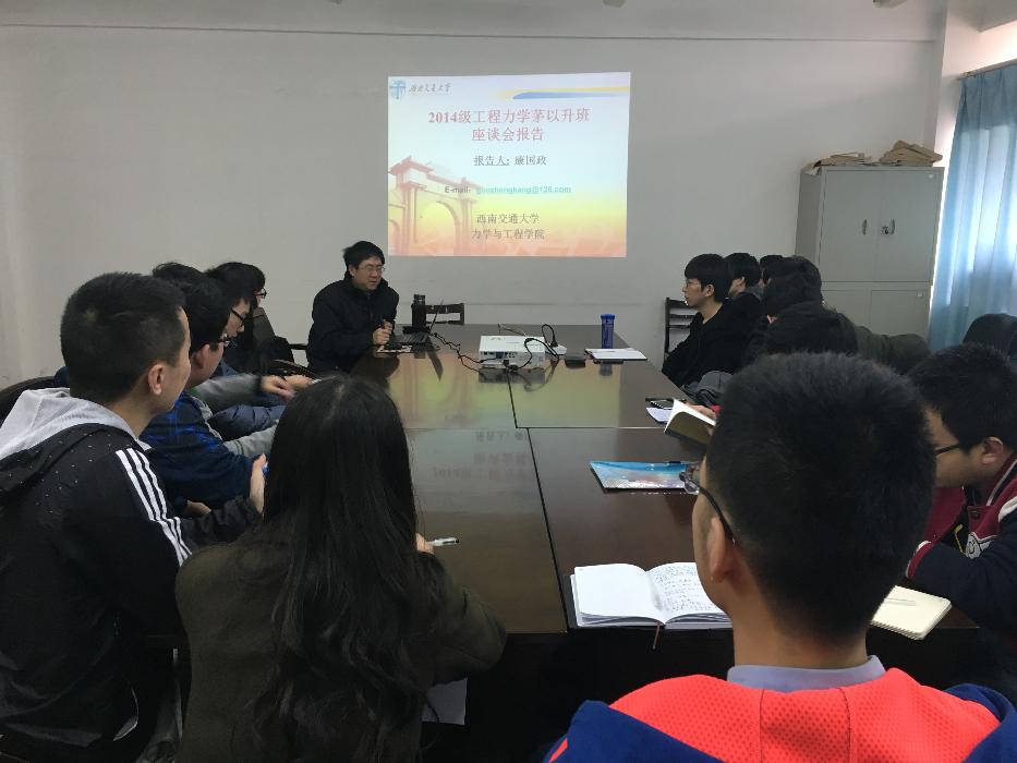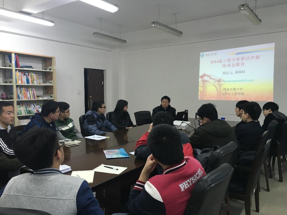 2017年3月3日,工力2014级茅班座谈会在X2307举行,出席本次会议的有2014级茅班班导师金建明书记、学院院长康国政教授、2014级茅班学生。