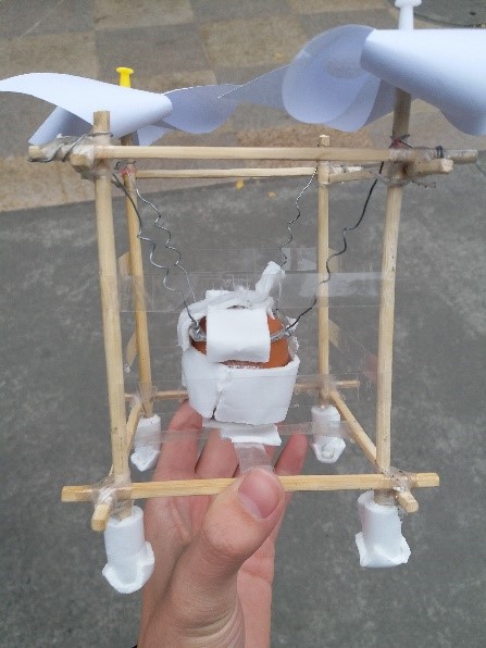 第63组,成员为组长金钊和组员钱阳,周晓芳。作品分为顶部风车部分,底部缓冲装置,消能结构,软接触设计和防触地设置,该装置设计合理,整体轻盈,约合80g,而这鸡蛋就占了50g,足以说明该装置之巧妙。而结果也在意料之中,完美着地而且未有太大碰撞,鸡蛋也是完好无损。