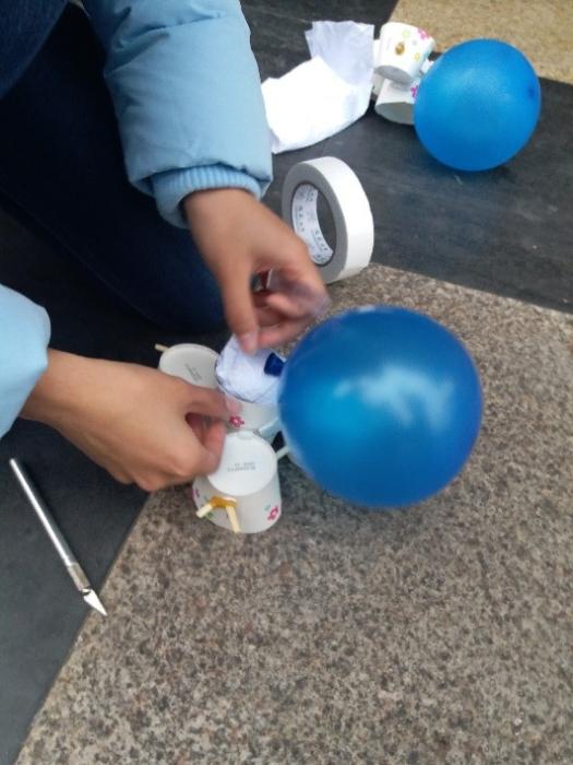 第29组,成员为袁鑫怡(负责实验测试 定点观察).陈鸿明(负责拍摄 PPT制作) .吴凡(负责装置改进 结构分析),鸡蛋稳稳落下,打开装置的过程也较为繁琐,原来鸡蛋被包在一个气球中间,切开气球后鸡蛋的确完好无损。