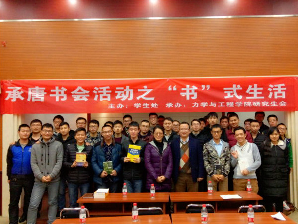12月8日下午16时,力学院承唐书会活动之“书”式生活在九里校区行政楼力学学院学术报告厅顺利举行。活动邀请到力学院党委副书记张军琪老师,研究生辅导员刘青老师莅临指导。研究生会成员及部分研一新生和本科生参加了本次活动。