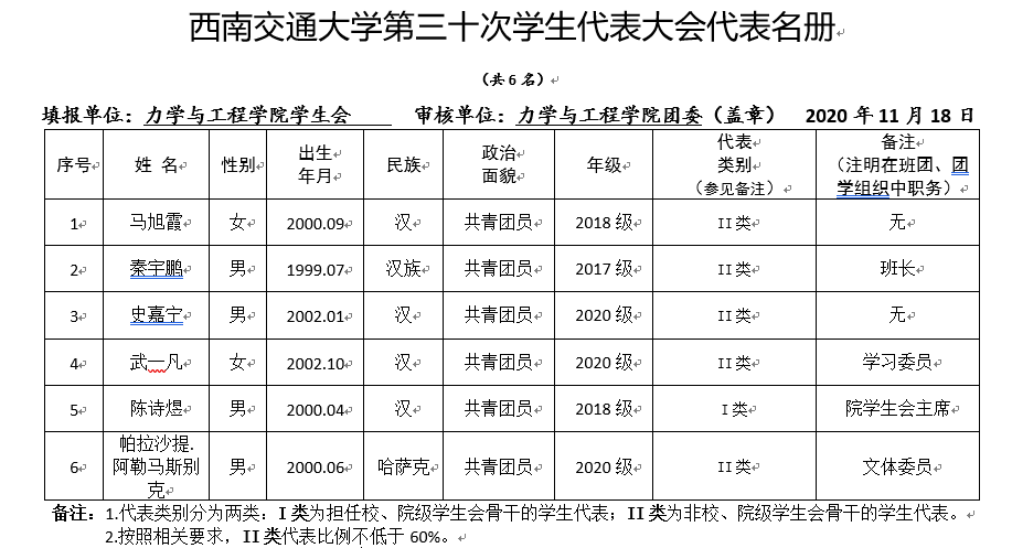 根据《关于做好正妹av 第三十次学生代表大会筹备工作的通知》,经班级(团支部)推荐、学院学生会组织召开学院学生的代表大会选举、学院团委考察等程序,拟推荐6名同学为正妹av 第三十次学生代表大会代表、1名同学为正妹av 第三十届学生委员会委员候选人,名单如下: