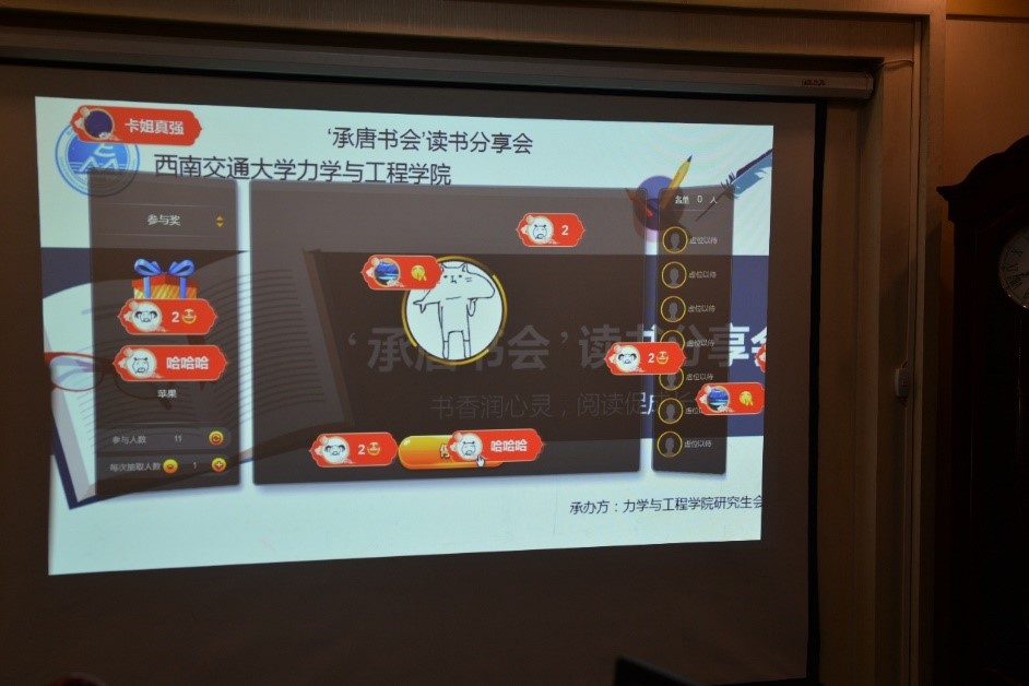活动中,共有六组同学与大家分享了他们推荐的作品。首先是杨涛同学为大家分享了余华的著作《许三观卖血记》,他从一段视频片段入手,带着大家一步步走进许三观的坎坷卖血经历,书中平平淡淡的文字里,慢慢的构建成一幅画卷,让读者感受到画卷里人物鲜活的生命力,揭示了平凡普通的生命谱写的惊涛骇浪人生与独特生命话剧。接下来郝港桐同学跟大家分享了《书店日记》,通过讲述作者肖恩这个二手书店长的吐槽故事来表达自己与书的共鸣。书中记录了关于书店的各种故事,碎碎念的故事片段极具生活味道,让我们了解美好的故事来源于生活。随后王瀚文同学给我们带来了刘慈欣的科幻巨作《三体》,地球文明与三体文明的碰撞与交流不禁让我们感慨作者天马星空的想象力和巧妙的构思。