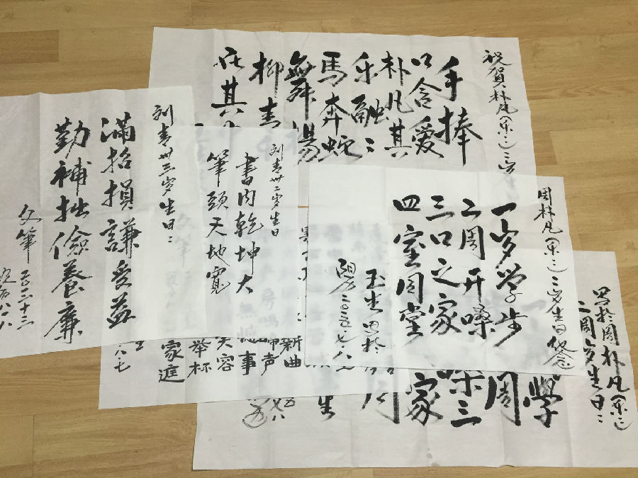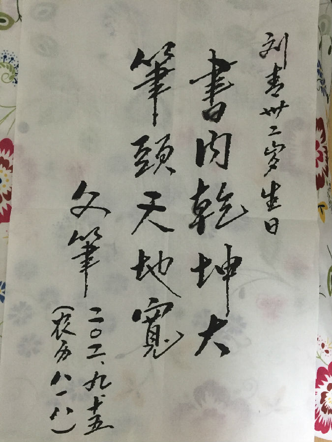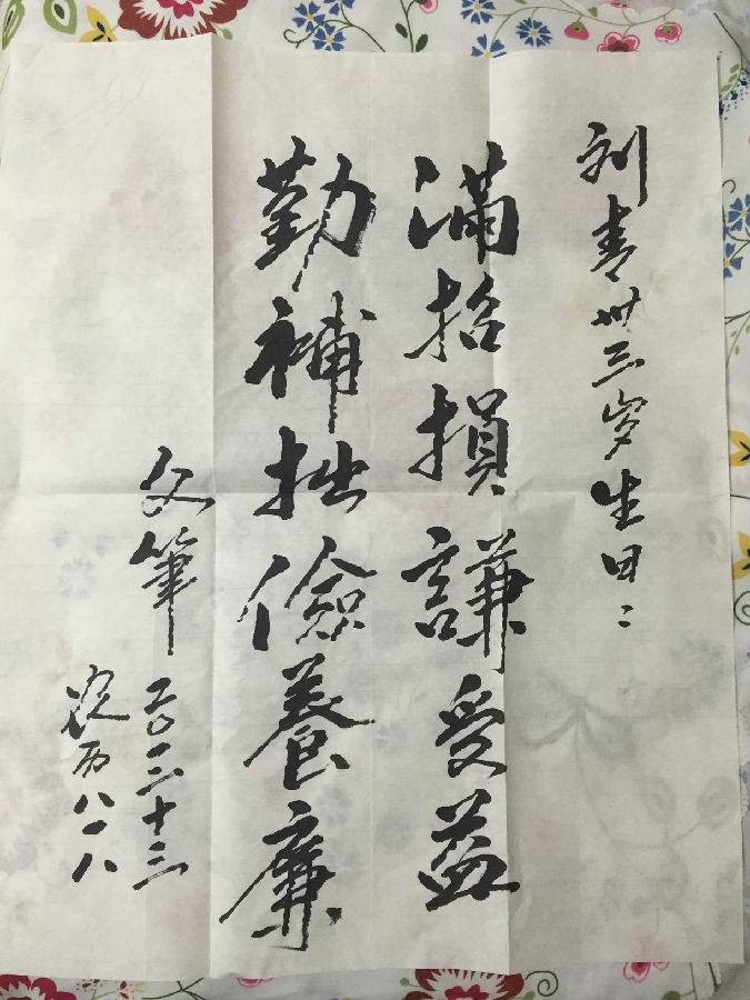 最值得一提的是,我们姐妹三人加上爱人孩子和父母共十二人,差不多每个月都有人过生日,几乎每个月都要在饭店举办“生日宴”。尤其是父亲,他爱好文学,退休之后练习书法,每逢家人生日,他都要书写贺辞一副。外甥女今年十九岁,她已经珍藏了十九副生日贺词。父亲的贺辞,不管是抄录古今诗词句还是自编诗文,都给我了巨大鞭策。例如,考上研究生那年写的是:“书内乾坤大,笔头天地宽”;毕业留校工作的那年写的是:“满招损,谦受益,勤补拙,俭养廉”。爱人属马,他毕业留校工作那年,父亲书写了“马不扬鞭自奋蹄”,对他激励很大;儿子一周岁生日时的贺辞也让我感叹不已,儿子名字叫“周朴凡”,刚出生时给他取小名“转转”,半年后觉得欠妥改小名为“乐乐”。生日那天父亲随手书写八个大字——“朴实不凡,转而为乐”,让全家人赞不绝口;更让人感动的是,去年父亲给母亲、我们姐妹及几个孩子均以长篇诗文记述每个人的经历、成绩、遗憾和希望,都是四十行左右的诗书,写在长幅宣纸上令人欣赏。写到此,我又不禁想起前年母亲生日宴,父亲写出贺辞——“无儿有女,有伴无虑”,把我们姐妹几个都感动的哭了······