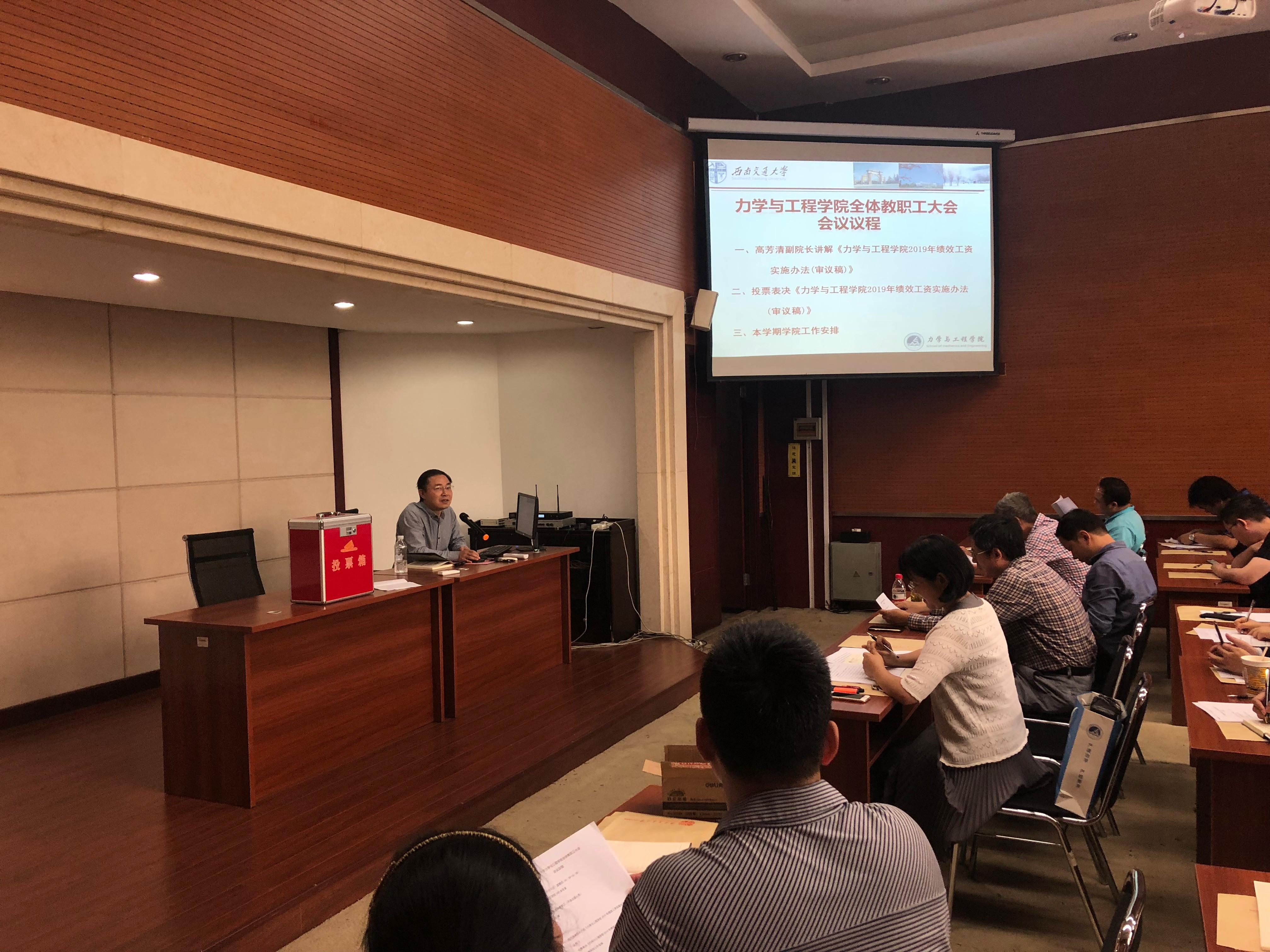 2019年9月5日下午14:30,在九里校区综合楼240会议厅召开了力学与工程学院全体教职工大会,以无记名方式对是否通过《力学与工程学院2019年绩效工资实施办法(审议稿)》进行了表决。会议由学院工会主席范晨光主持。