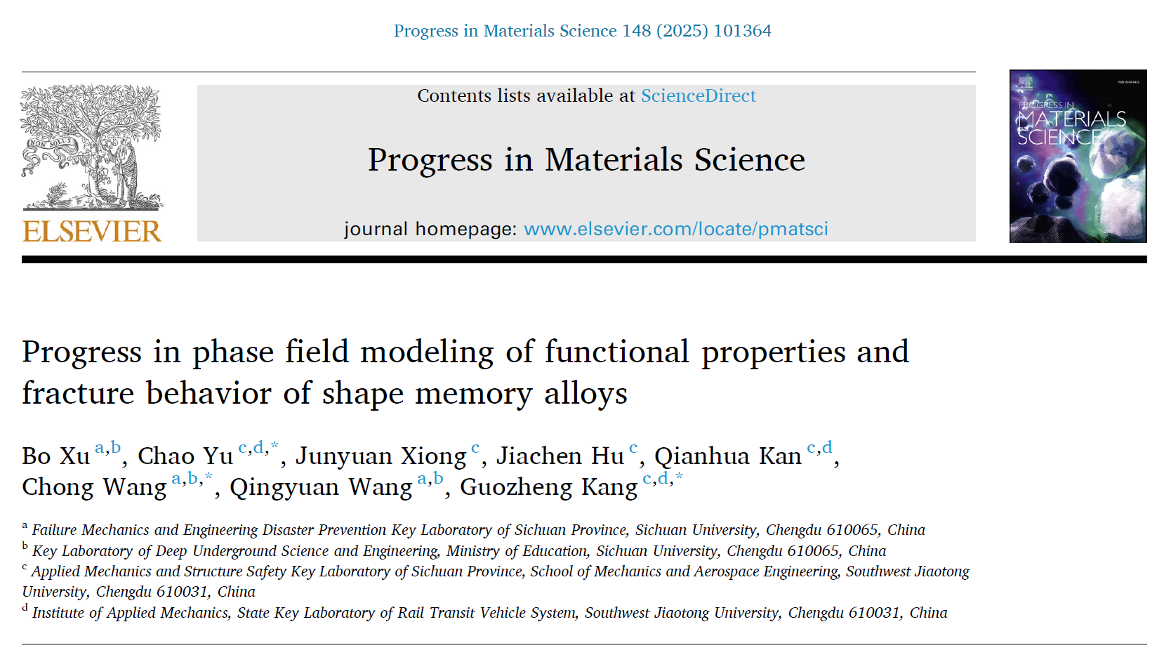 近日,西南交大康国政教授团队在顶级综述期刊Progress in Materials Science(IF = 33.6)上发表了题为“Progress in phase field modeling of functional properties and fracture behavior of shape memory alloys”的综述论文。已毕业博士生徐波(现就职于四川大学)为论文第一作者,西南交大康国政教授、于超教授和四川大学王宠教授为论文共同通讯作者,西南交大阚前华教授、四川大学王清远教授和西南交大正妹av