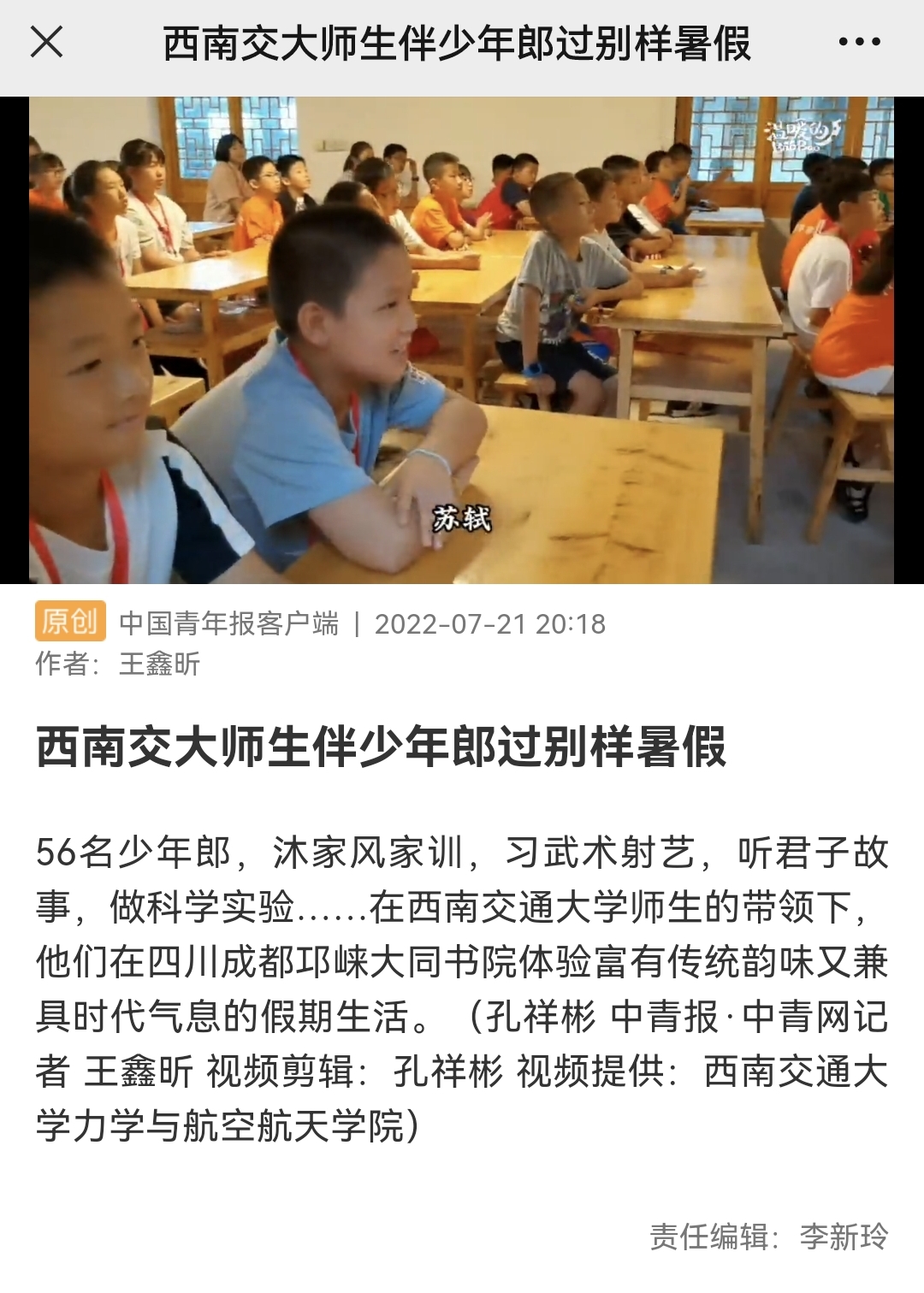 实践队受到多方媒体的关注,《成都日报》于7月15日以《‘神兽’暑假怎么过?来和孔子后裔一起参加‘家风训练营’》为题进行了报道,《中国青年报》客户端在7月21日以《西南交大师生伴少年郎过别样暑假》为题发表了介绍家风训练营的短视频,《四川日报》则从00后青年大学生参与乡村振兴的角度对实践队成员进行了深度采访,新闻将于近期刊发。