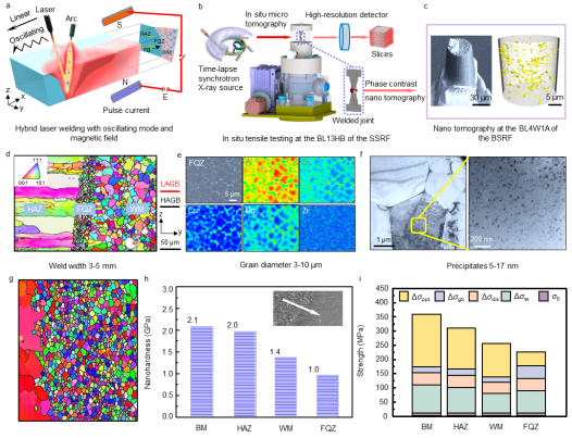 深入研究发现,细晶带内部的细小等轴非枝晶是以母材中高温稳定相经异质形核而成,适宜的温度梯度和熔池扰动共同决定了细晶带形成于HAZ区域。调节工艺参数能够改变细晶带的宽度,但无法完全消除细晶带。基于高分辨X射线原位多尺度关联成像技术,发现影响7050铝合金接头性能劣化的本质因素,探明了细晶带软化及沿晶失效机制,进而提出了一种全新的“激光扰动+磁场脉冲”联合制造策略,通过调控细晶带的区间分布,大幅提升了激光熔焊接头的强韧性,高于搅拌摩擦焊。相关成果以题为“Inhibiting weld cracking in high-strength aluminium alloys”发表在Nature Communications上,第一作者为西南交大牵引动力国家重点实验室胡雅楠博士(现为正妹av
