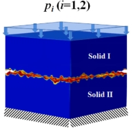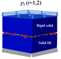 图1.固体I(压电或非压电材料)与固体II(压电材料)在广义荷载pi(i=1,2)的作用下发生接触(a);接触问题(a)的等效模型,其中固体III具有等效的材料参数与粗糙度(b)
