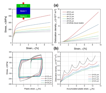 为了验证模型的合理性,本研究首先将该模型应用于具有周期结构的双晶镁,研究了单拉和循环加载时晶粒尺寸对位错分布、晶界位错堆积以及背应力的影响,揭示描述尺寸效应的Hall-Petch指数与位错累积及背应力有关(图1)。