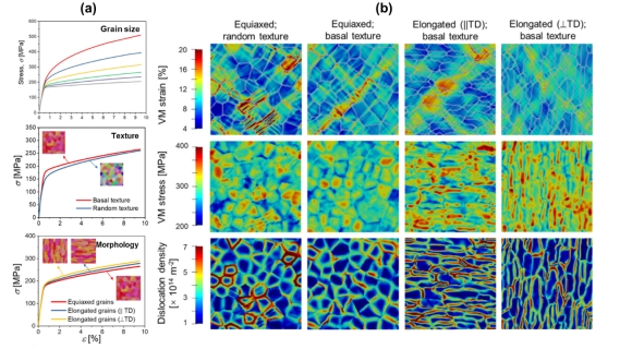 图2(a)微观结构对多晶镁力学性能的影响;(b)不同晶粒形态的多晶镁在宏观应变10%时的应变、应力和位错分布云图