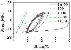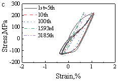 图3挤压AZ31镁合金不同应力水平下的应力-应变响应:(a)平均应力为负;(b)平均应力为正且较高;(c)平均应力为正且较低