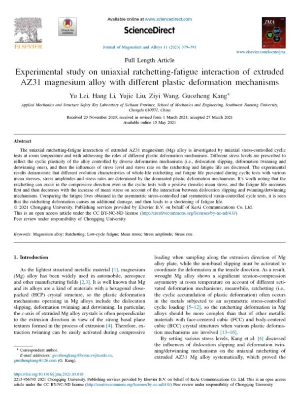 博士生雷宇在镁合金领域专业学术期刊《Journal of Magnesium and Alloys》(中科院一区TOP,IF:11.862)发表了题为“Experimental study on uniaxial ratchetting-fatigue interaction of extruded AZ31 magnesium alloy with different plastic deformation mechanisms”的研究成果,康国政教授为通讯作者,合作者包括李航博士、刘宇杰副教授和王子仪博士。