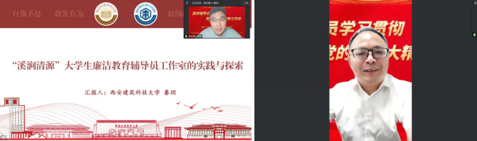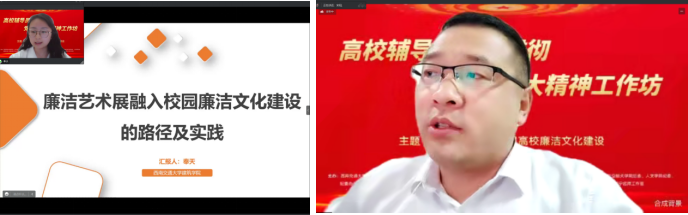 建筑学院辅导员奉天以“廉洁艺术展融入校园廉洁文化建设的路径及实践”为主题,介绍了学院围绕廉洁教育开展的一系列艺术展览活动。学院将美育协同的育人思路与学院学生特色相结合,将廉洁文化的教育目标融入到美育和专业课程的育人目标中,形成了以廉洁艺术展为载体的廉洁教育体系,为校园廉洁教育提供了方法和路径。西安建筑科技大学马克思主义学院党委书记宋阳进行了点评,他表示廉洁艺术展是一堂生动的廉洁文化课,能够让观展者在感受艺术魅力的同时,推动廉洁文化深入心灵,引导广大师生更加关心、关注和参与到廉洁文化建设中来,充分发挥了廉洁文化教育人、影响人和鼓舞人的重要作用。