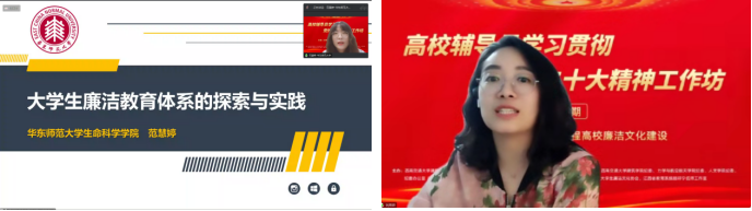 华东师范大学生命科学学院辅导员范慧婷以“大学生廉洁教育体系的探索与实践”为主题,介绍了学院以三全育人为切入视角,通过梳理整合大学生廉洁教育的师资队伍和施教内容,通过全员、全过程、全方位的大学生廉洁教育体系构建,分层次、分阶段、分步骤施教,建立起科学合理完善的大学生廉洁教育体系。南京航空航天大学人文与社会科学学院党委副书记刘思辰进行了点评,她认为该院从大学生廉洁教育的意义和现状入手,从全员、全过程、全方位三个方面开展廉洁教育活动的方法和政绩,形成了教育引导合力,这种有温度的廉洁教育非常值得借鉴。