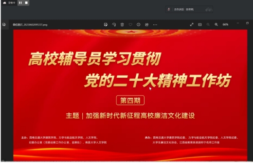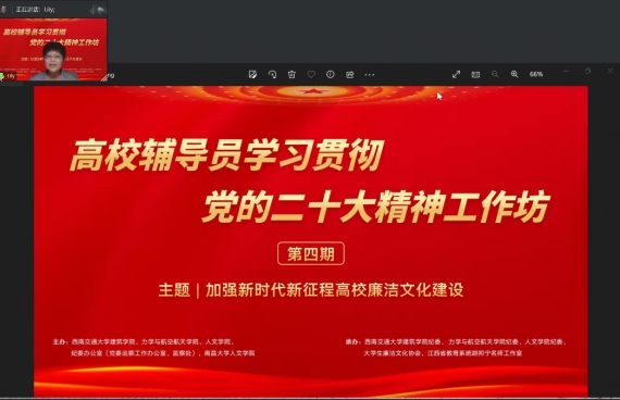 2023年6月3日,以“加强新时代新征程高校廉洁文化建设”为主题的高校辅导员学习贯彻党的二十大精神工作坊第四期在线上成功举办。工作坊由正妹av