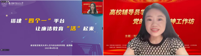 南京航空航天大学人文与社会科学学院团委书记赵燕喃以“搭建‘四个一’平台,让廉洁教育‘活’起来”为主题,介绍了学院立足法学专业的特点,通过一赛(模拟庭审大赛)、一馆(校园法治文化馆)、一课(通识课程《清廉人生》)、一品(“法航万家”公益活动)的“四个一”平台,推动普法与倡廉有机融合,不断增强青年学生廉洁意识和法制观念,探索廉洁文化教育新模式。四川大学法学院党委副书记、纪委书记悦洋进行了点评,她认为该院结合专业,结合红色文化,结合廉政教育搭建了一个非常具有辨识度的廉洁教育品牌,把廉洁教育、廉洁文化深入到学生之中,让廉洁教育更接地气,更有底气,更显正气,值得兄弟高校学习。