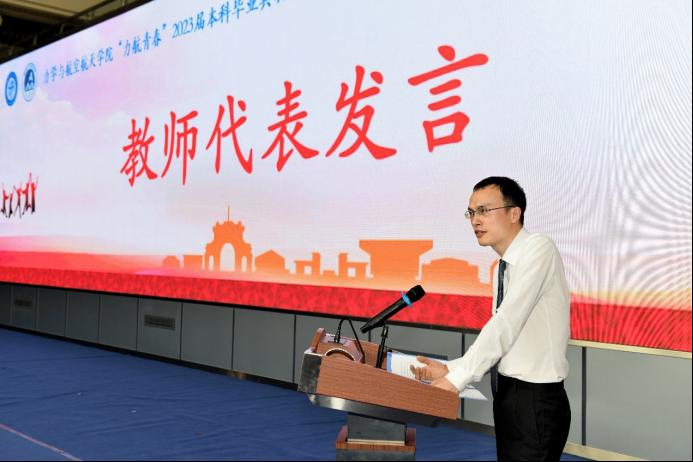 飞行2019-01班班导师胥奇做教师代表发言,回顾了四年以来和同学们的快乐时光,祝福同学们奔赴下一站旅程去实现自己的梦想。