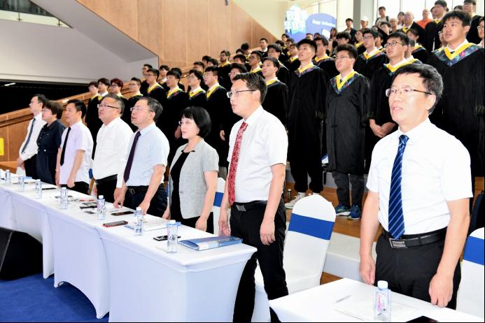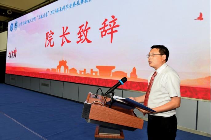 全体师生奏唱国歌之后,学院执行院长李翔宇讲话。他代表学院全体师生向2023届毕业生们表示热烈的祝贺,对同学们和学院取得的成绩表示高度赞扬,并提出三点殷切希望:第一,宁做自律慎独的逆行者,不做人云亦云的跟风人;第二,宁做筚路蓝缕的实干者,不做高谈阔论的清谈家;第三,宁做奔涌入海的一滴水,不做独居一隅的一汪池。