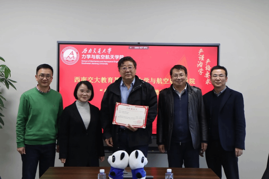 温朋副处长代表学校接受基金捐赠,表示学校会管好基金,为人才培养和学校事业发展做出贡献。随后温朋副处长和李翔宇院长、栗民书记、孔祥彬副书记一起为蔡力勋教授颁发捐赠证书、赠送纪念品。