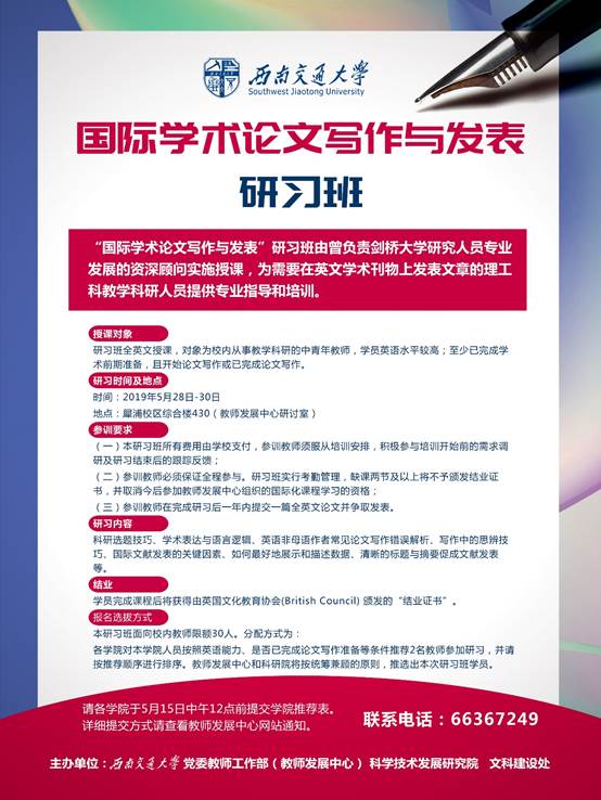 为推进实施学校国际化战略,提升教师科研的国际化水平,促进国际交流与合作,西南交大党委教师工作部(教师发展中心)和科学技术发展研究院联合英国领事馆文化教育处,引进国际学术论文写作与发表研习课程(Academic Writing for Publication)。现将有关事项通知如下: