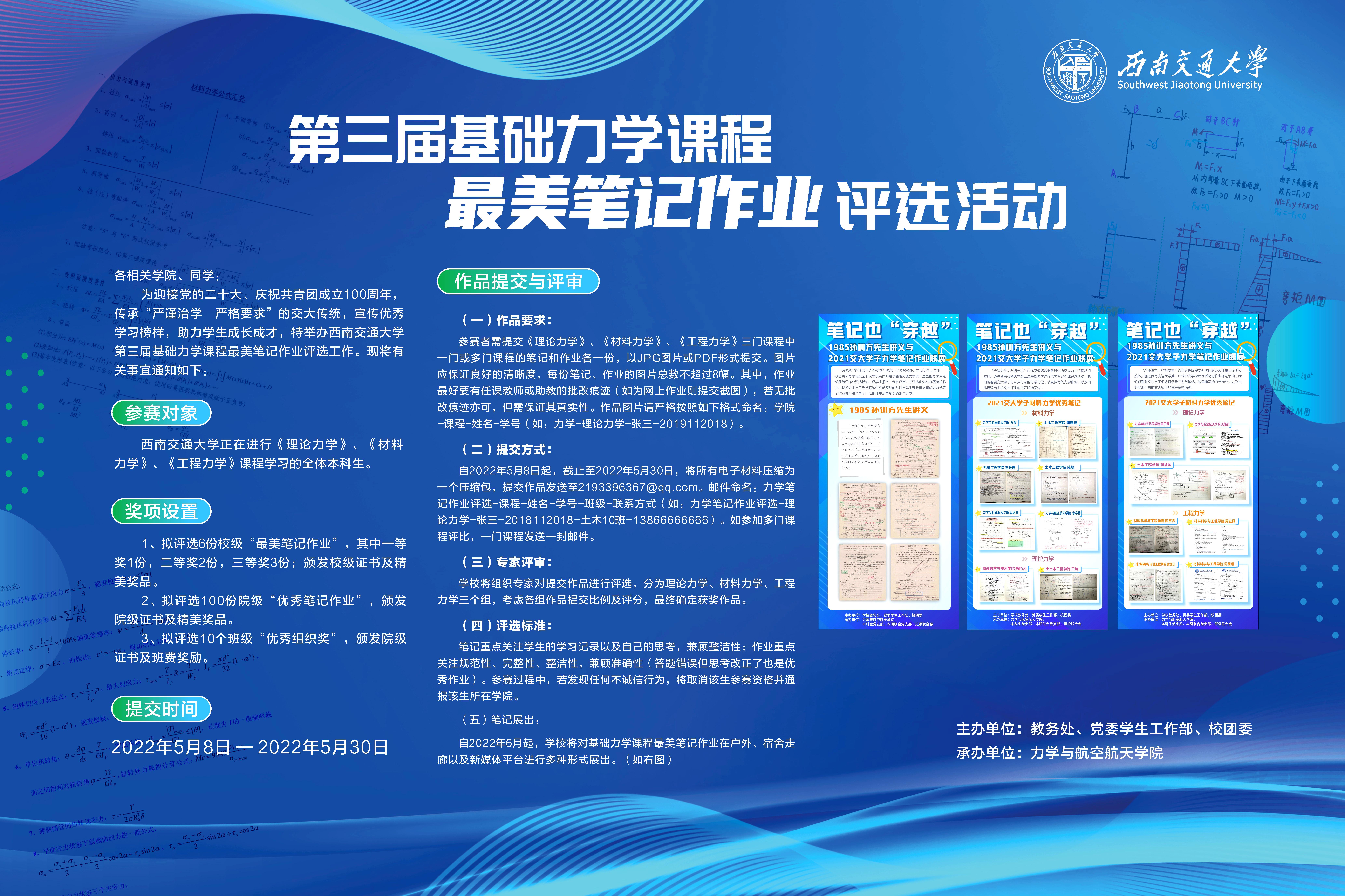 (二)提交方式:自2022年4月25日起,截止至2022年5月20日,将所有电子材料压缩为一个压缩包,提交作品发送至[email protected]。邮件命名:力学笔记作业评选-课程-姓名-学号-班级-联系方式(如:力学笔记作业评选-理论力学-张三-2018112018-土木10班-13866666666)。如参加多门课程评比,一门课程发送一封邮件。