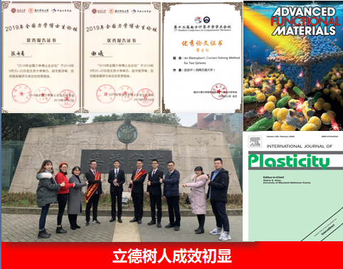 大力加强科研育人工作,研究生创新成果突出:博士生本年度发表高水平SCI论文64篇,毕业博士生人均发表第一作者SCI论文4.27篇,位居全校第一。1名博士生论文发表在国际顶级期刊Advanced Functional Materials(影响因子15.621)上,1名博士生发表的论文入选ESI高被引论文。1个班级获评“忠忱”班集体,1名博士生获校级最高荣誉竢实扬华奖章。1名博士获得南方计算力学优秀论文奖,2名博士获全国力学博士生论坛优秀论文奖。