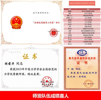 以教学为本,教授为本科生授课率100%。1名教师获教育部“全国优秀教育工作者”称号,3名教师获“四川省教书育人名师”称号,1名教师获“詹天佑铁道科学技术奖”,1名教师获全国徐芝纶优秀教师奖。2名教师获校第九届青年教师讲课比赛一等奖,2名教师分别获二等和三等奖。