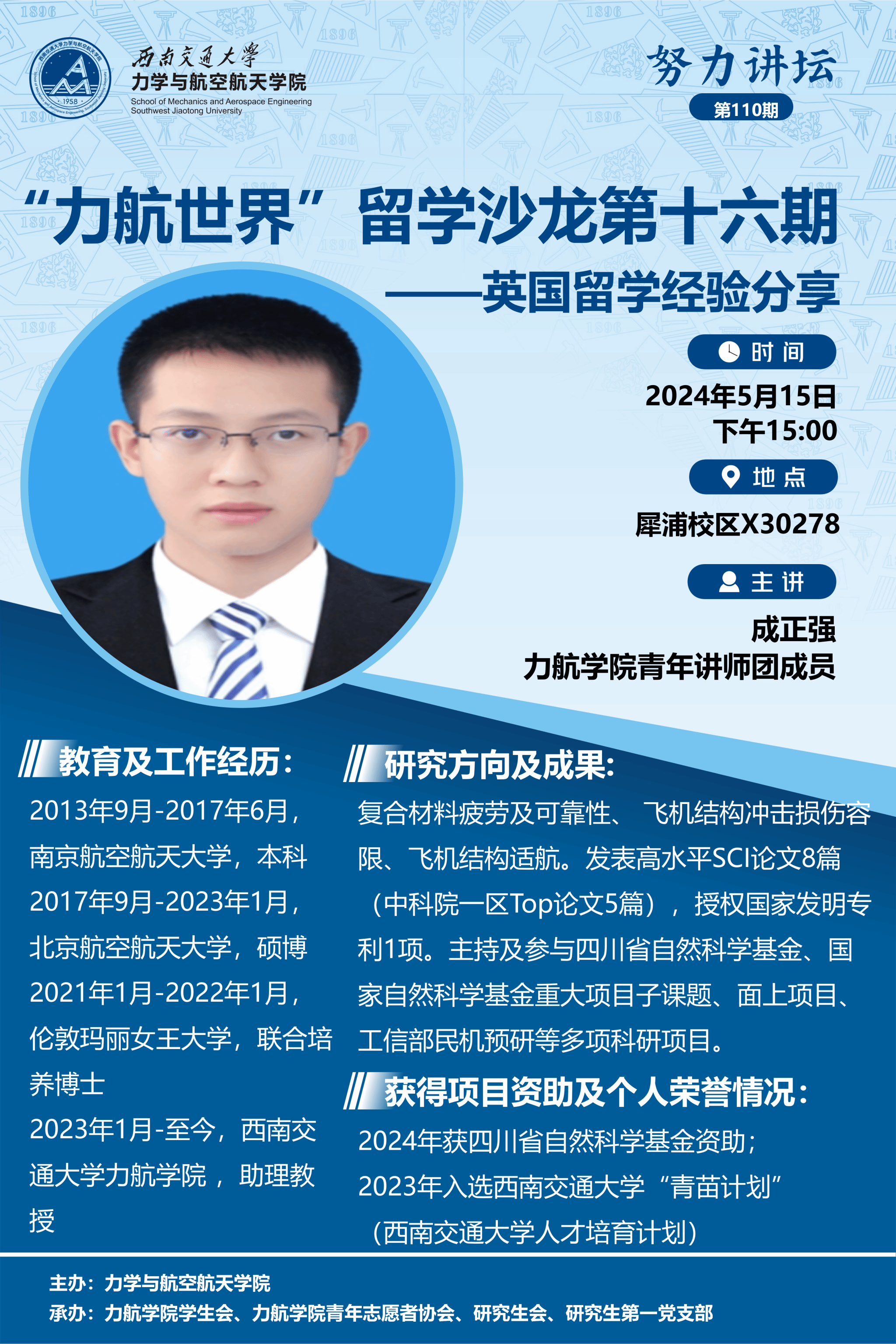 任教。本次活动,成正强老师以“英国留学经验分享”为题,从个人简介、英国留学经验分享、科研方向简介等几个方面进行了分享。