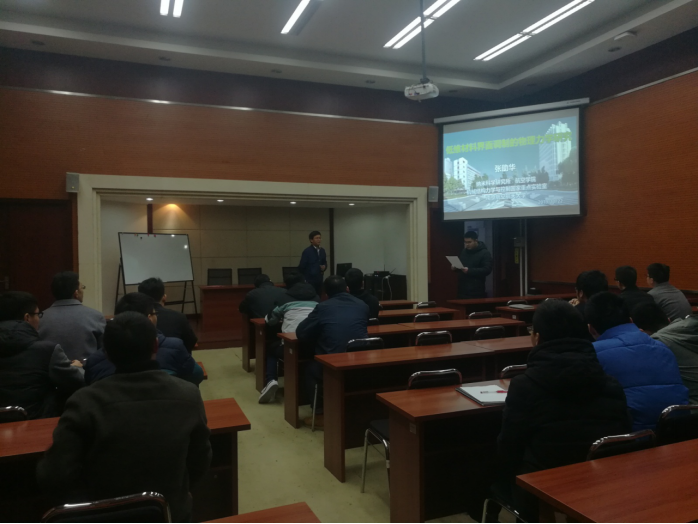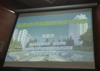 张助华教授师从南京航空航天大学郭万林院士,他首先介绍其从博士期间到目前为止的主要工作,一方面包含低维材料与结构的研究,另一方面为能量的转化和收集,目前这些工作在学术界已经引起了较大的反响。讲座中,张教授讲到,低维材料与结构的研究与应用均离不开界面问题,界面即是材料结构与器件系统必备的组成部分,又是获取新奇性质与功能的重要源泉。利用界面相互作用设计低维材料的结构和性质,实现了能够转换以及水能捕获。能量转换和水能捕获也经历了不同的阶段,从通过界面设计实现动能转换为电能,到通过水蒸发来收集能量的过程(称之为:“水伏效应”),该过程凝聚了张教授团队的心血。张教授还从微观的原子结构设计介绍了二维硼原子晶体(硼烯)的制备,即为在金属衬底上出现的一系列结构调控行为和新奇的物理力学性质,张教授从理论上介绍和解释了硼原子与衬底之间的相互作用及其稳定性生长,进而还被后续的实验成功实现。