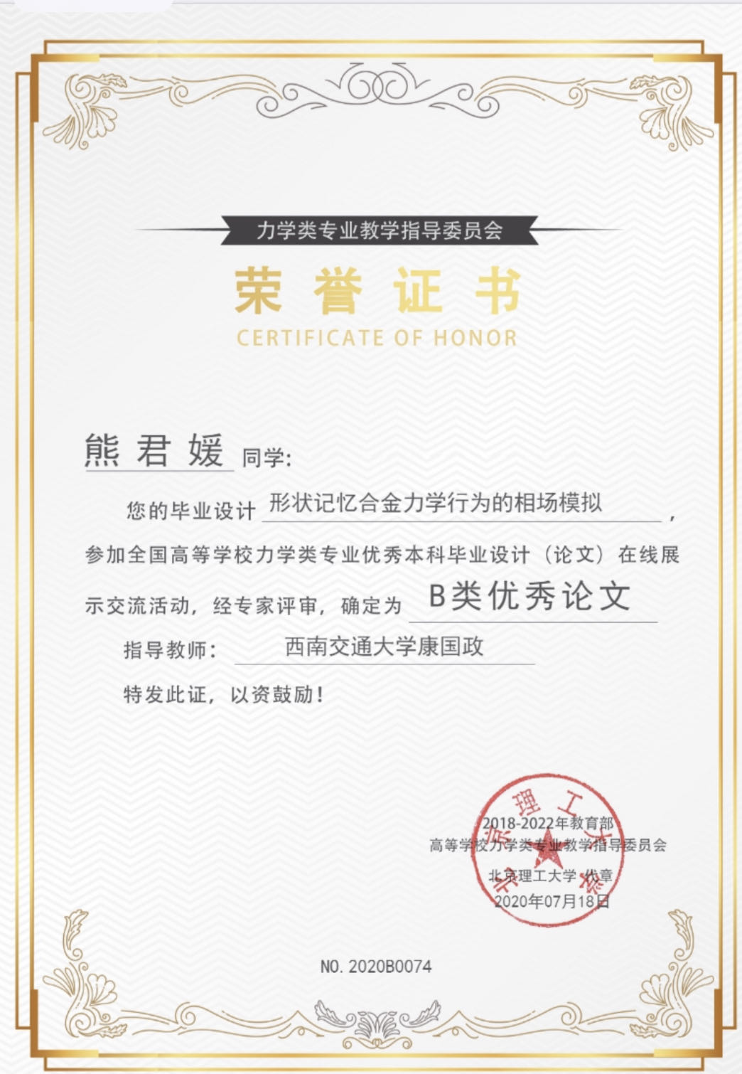 参加评选的两位同学均获奖。其中,吴凡同学的本科毕业论文“基于动网格仿真技术的鱼类游动的推动特性研究”荣获A类优秀论文,熊君媛同学的本科毕业论文“形状记忆合金力学行为的相场模拟”荣获B类优秀论文。他们的指导老师分别为李鹏副教授和康国政教授。