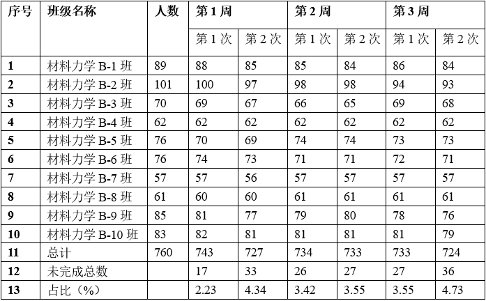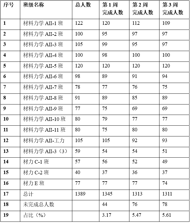 最后,龚晖教授报告了SOTS后台记录的前三周学生学习材料力学的大数据反馈结果(如表1和表2所示),2149名学生中约有95%的同学能够很好地完成任课教师发布的学习任务(包括教学视频和网上作业)。材力AII没有完成学习任务的学生人数最多一次为78人,占5.61%;材力B没有完成学习任务的学生人数最多一次为36人,占4.73%。二者之和最多为114人,这与开课之初统计到的100名左右没有在线学习条件的学生人数具有一定的相关性。以上数据表明,在全体材料力学课程团队成员的努力下,线上授课运行秩序和效果良好。此外,有相当多的学生表示SOTS平台的学习效果优于其他线上教学平台,表明正妹av