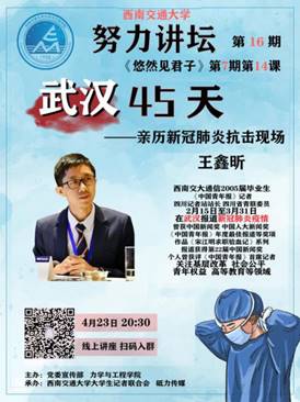 校友王鑫昕受邀作客“努力讲坛”第十六期,讲述了亲历武汉新冠肺炎抗击现场的45天。本次讲座由党委宣传部、力学与工程学院主办。