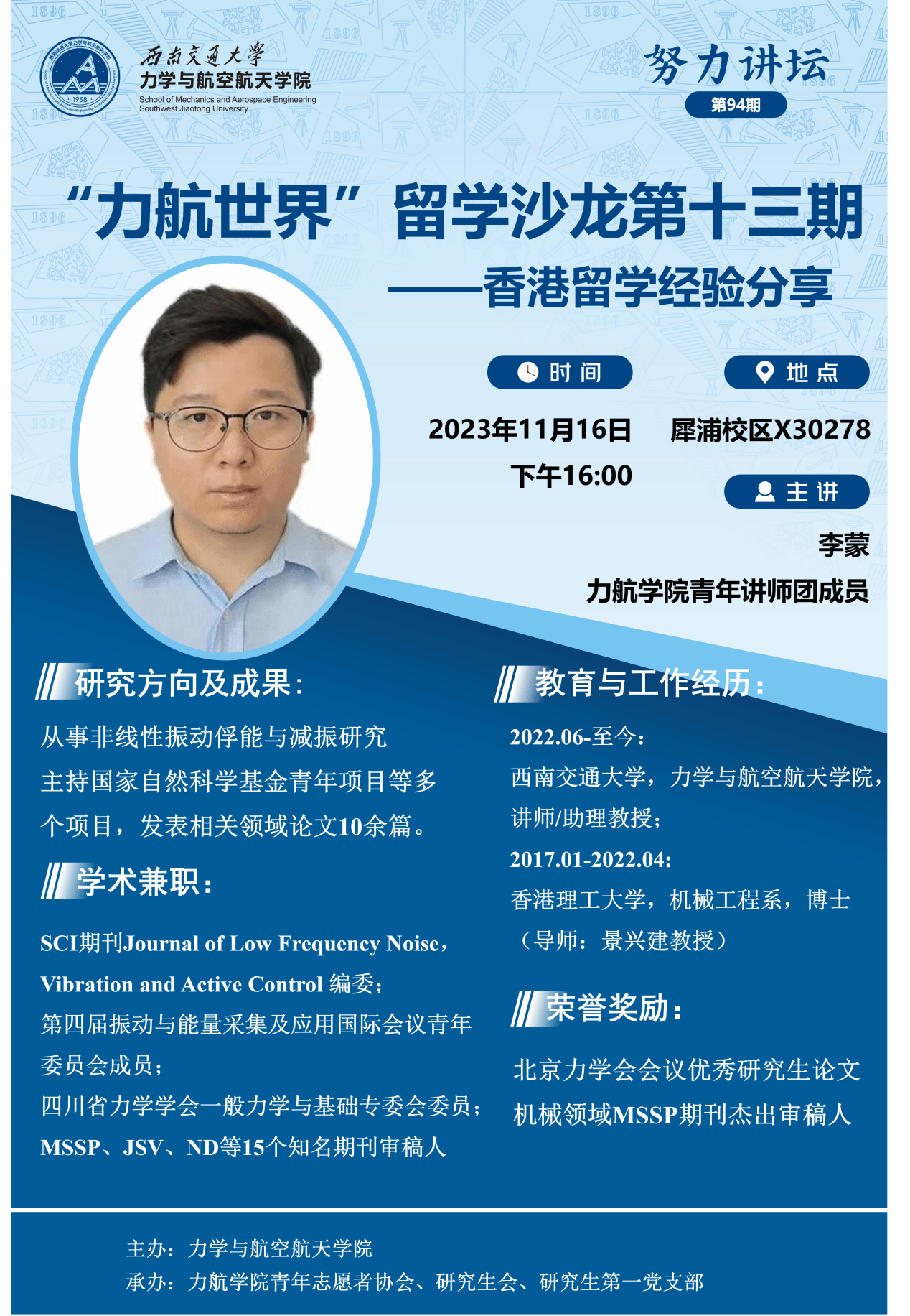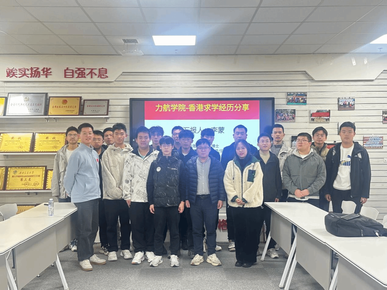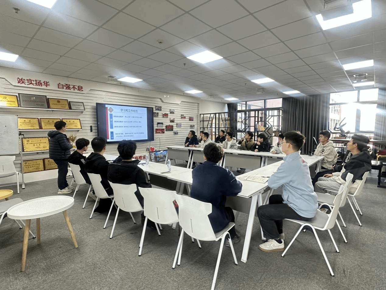“青年讲师团”成员李蒙老师为同学们分享他的学习经历和在香港理工大学的深造科研经历。辅导员陈蕾、安晟斐及学院10余名同学参加了本次活动。
