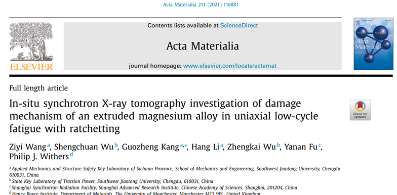 康国政教授带领的材料本构关系及疲劳断裂团队在镁合金疲劳损伤机理方向取得重要进展,相关工作以“In-situ synchrotron X-ray tomography investigation on damage mechanism of an extruded magnesium alloy in uniaxial low-cycle fatigue with ratchetting”为题发表在金属材料领域顶级期刊《Acta Materialia》(IF:7.656,中科院一区)上,论文链接://doi.org/10.1016/j.actamat.2021.116881。博士研究生王子仪为论文的第一作者,吴圣川研究员为第二作者,英国曼彻斯特大学材料学院教授、中国科学院外籍院士Philip J. Withers和上海同步辐射光源付亚楠研究员为共同作者,康国政教授为通讯作者。