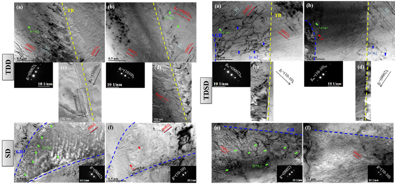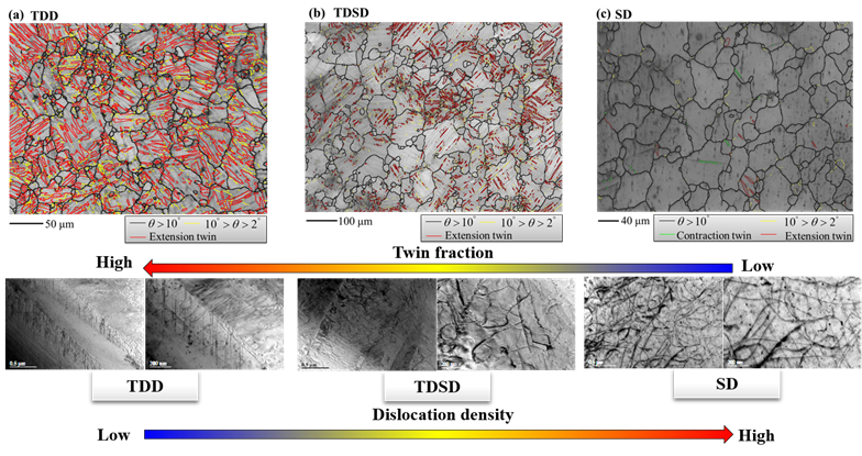 进一步的EBSD和TEM表征表明:TDD样品中出现大量孪晶,TDSD中孪晶体积分数相比而言减少,而SD样品中孪晶数量极少;三种样品中位错密度的多寡与孪晶体积分数的分布规律恰好相反;TDD样品中以高密度的基面[c]位错和<a>位错为主,TDSD和SD样品中额外发现较高密度的<c+a>位错。