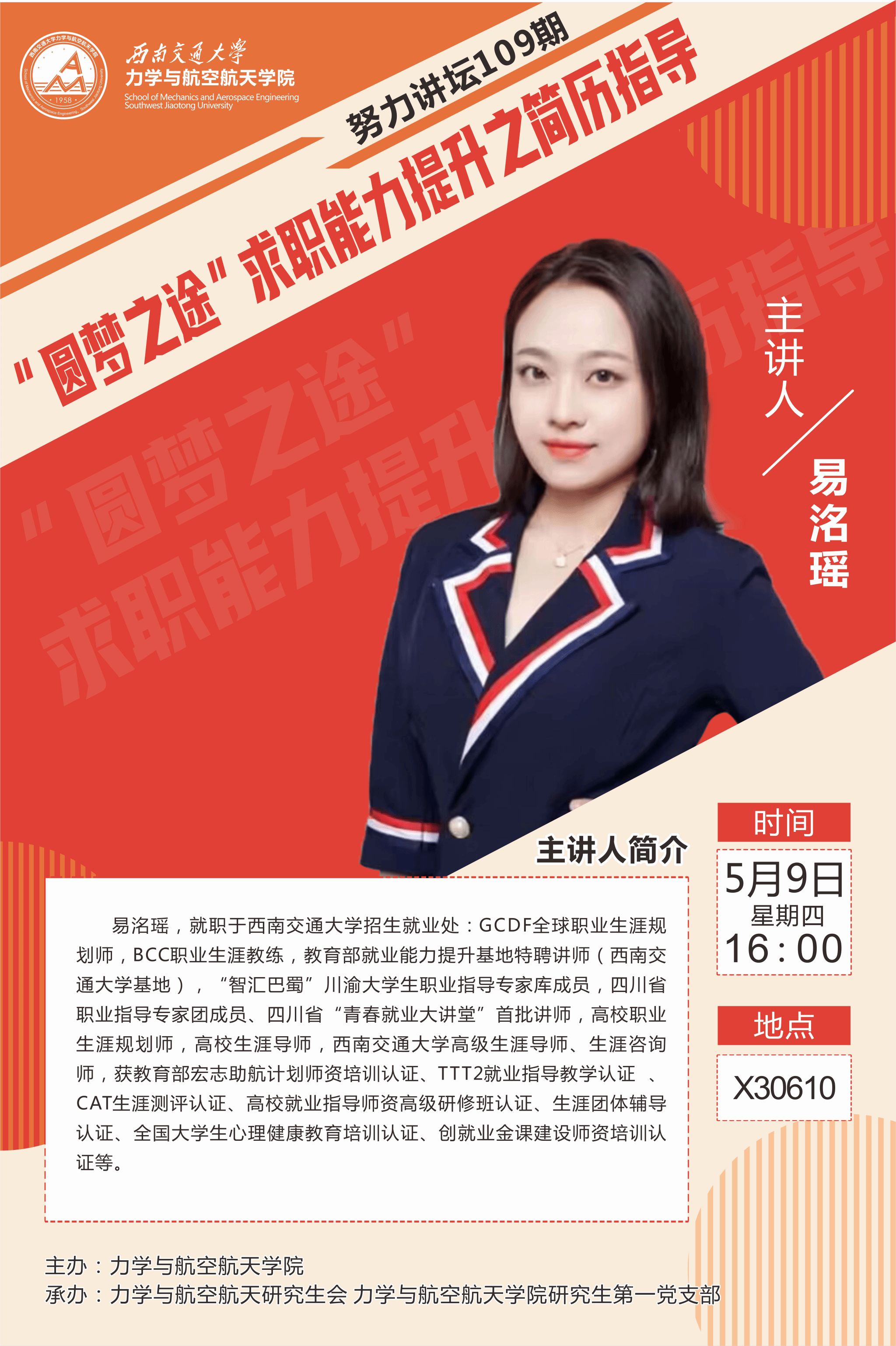 “力久弥新,航宇未来”生涯咨询室在犀浦校区X30610教室成功举办了“努力讲坛”第109期活动,主题为“圆梦职途”求职能力提升之简历指导。此次活动特邀了正妹av
