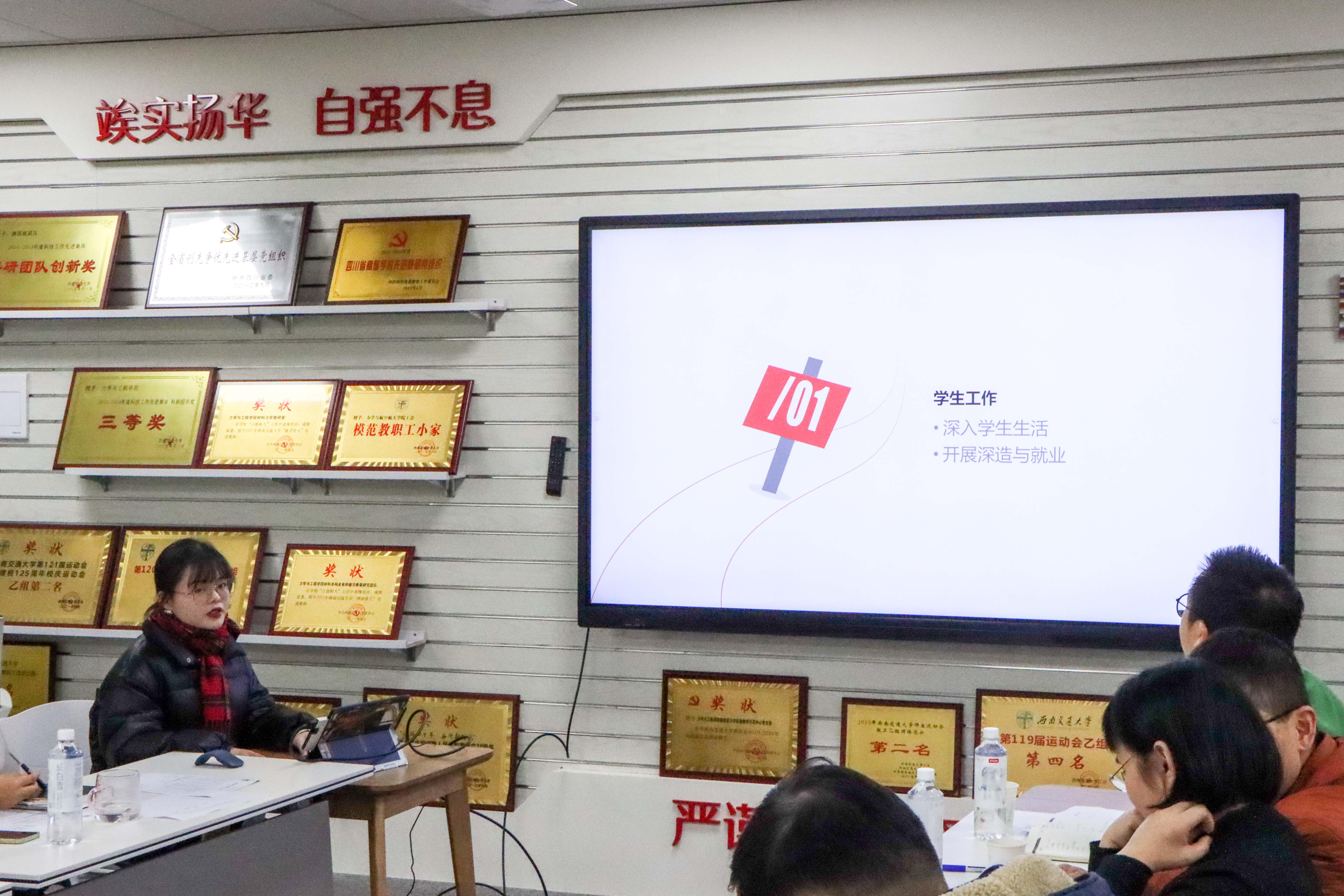 会上,各年级辅导员就2021年工作进行了年终述职:杨婧主要汇报了2019级本科生管理工作、学院学生工作、学院团委工作等;张容华汇报了学生思想理论教育、学生日常事务管理、学生学风建设工作、学生党建工作以及学生就业工作等;周子涵汇报了2020级本科生管理工作、疫情防控、科创竞赛、班风学风、社会实践、学生资助以及学院宣传等工作;王彪汇报了2021级新生、本科党建工作以及学院学风建设等专项工作;于红琴汇报了研究生辅导员工作和研究生会指导工作等;田甜汇报了2018级学生工作、团委工作以及学院宣传等其他专项工作。