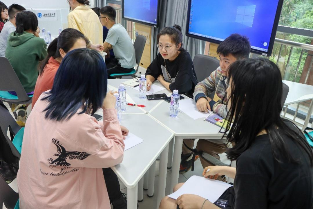 在交流会上,陈老师将同学们分成四个小组,带领同学们进行了一些小测试,来判断自己是否适合继续考研。陈老师让同学们以小组为单位进行讨论,对自己的第一次考研做出评价,思考自己是否对自己的表现满意,和小组成员讨论后进行分享。活动环节,同学们十分积极地展开讨论,并主动和其他同学们分享自己的看法。
